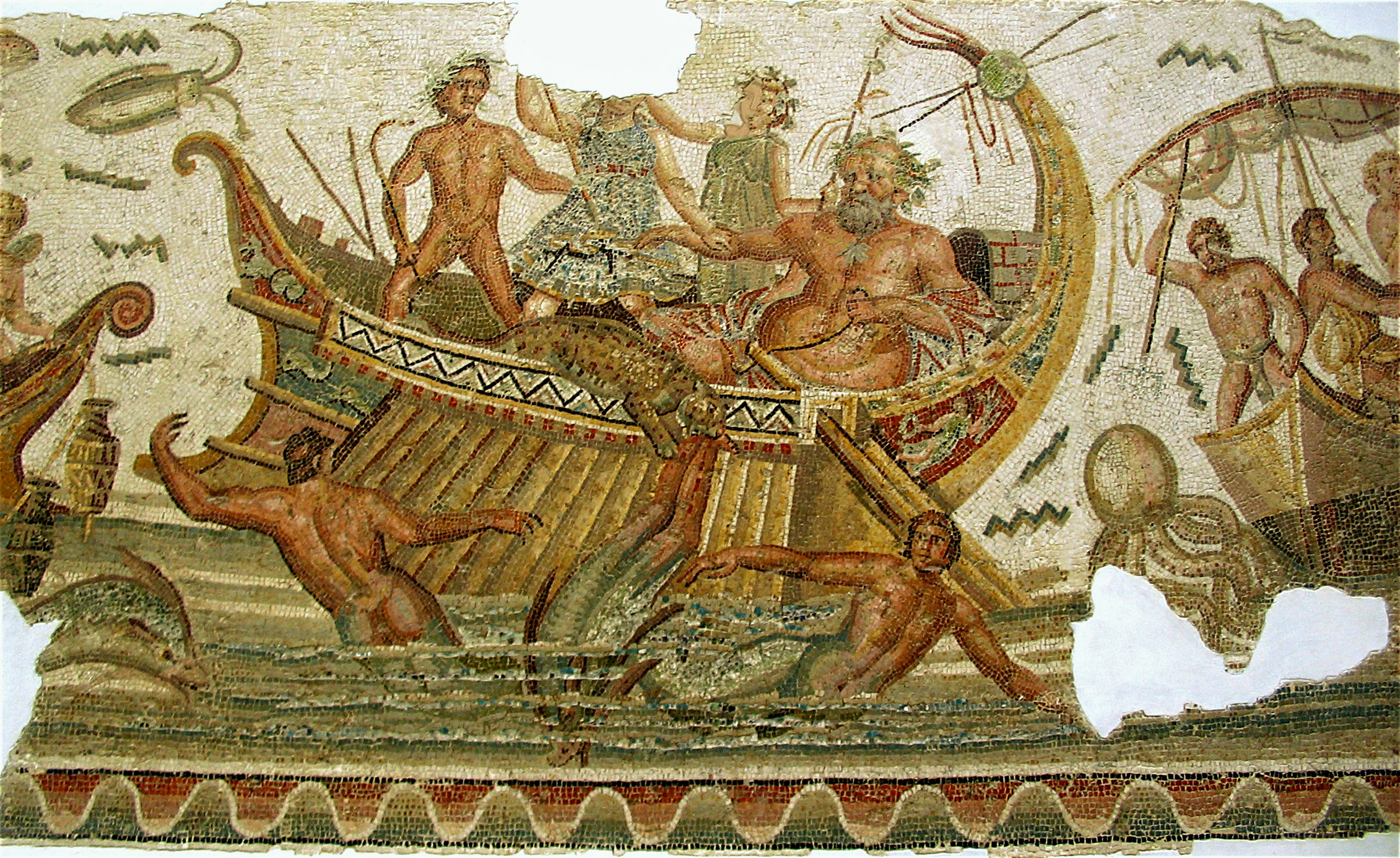 „Mozaika znajdująca się w Muzeum Narodowym Bardo w Tunezji. Jest ona jednym z nielicznych przedstawień ikonograficznych, z odwołaniem do piractwa. Przedstawia Bachusa (Dionizosa), przemieniającego napadających piratów w delfiny. Autor: Habib Mhenni. Zdjęcie na licencji creative commons Wikipedia