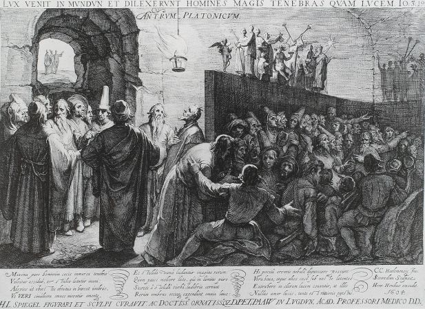 Wyobraźcie sobie ludzi żyjących w jaskini. Kajdanami przykuto ich nogi i szyje tak, że nie mogą zmienić miejsca swego pobytu ani widzieć tego, co znajduje się poza nimi. Ponieważ wejście do jaskini jest otwarte, dochodzi do środka światło, a na jej ścianach pojawiają się cienie rzeczy znajdujących się poza nią. Kajdaniarze jednak nic nie wiedzą o źródle tych cieni i biorą je za prawdziwe rzeczy. Nawet wyzwoleniec, któremu dane jest wyjść z jaskini, z początku nie może przyzwyczaić się do blasku słońca i uwierzyć, że znajduje się w prawdziwym świecie. Dopiero gdy dojdzie do siebie, odkryje jego nieporównywalną wartość. Nie jest jednak w stanie przekonać do niej tych, co pozostali na dole w kajdanach.