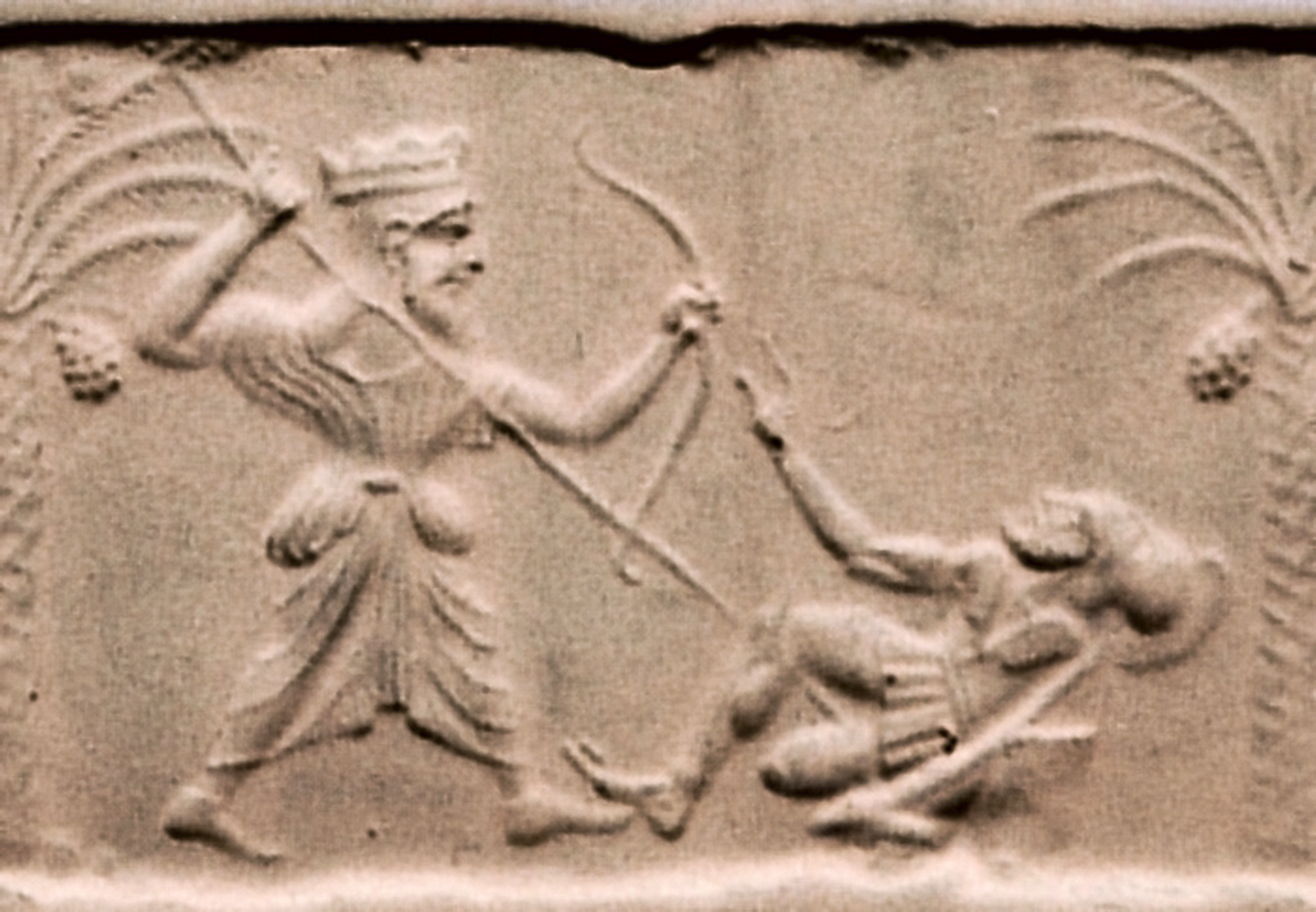 Król Achemenidów w koronie zabijający greckiego hoplitę. Odcisk pieczęci cylindrycznej, wyrzeźbiony około 500 p.n.e. – 475 p.n.e., w czasach Kserksesa I. Metropolitan Museum of Art